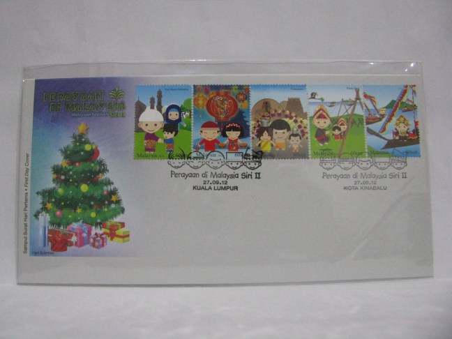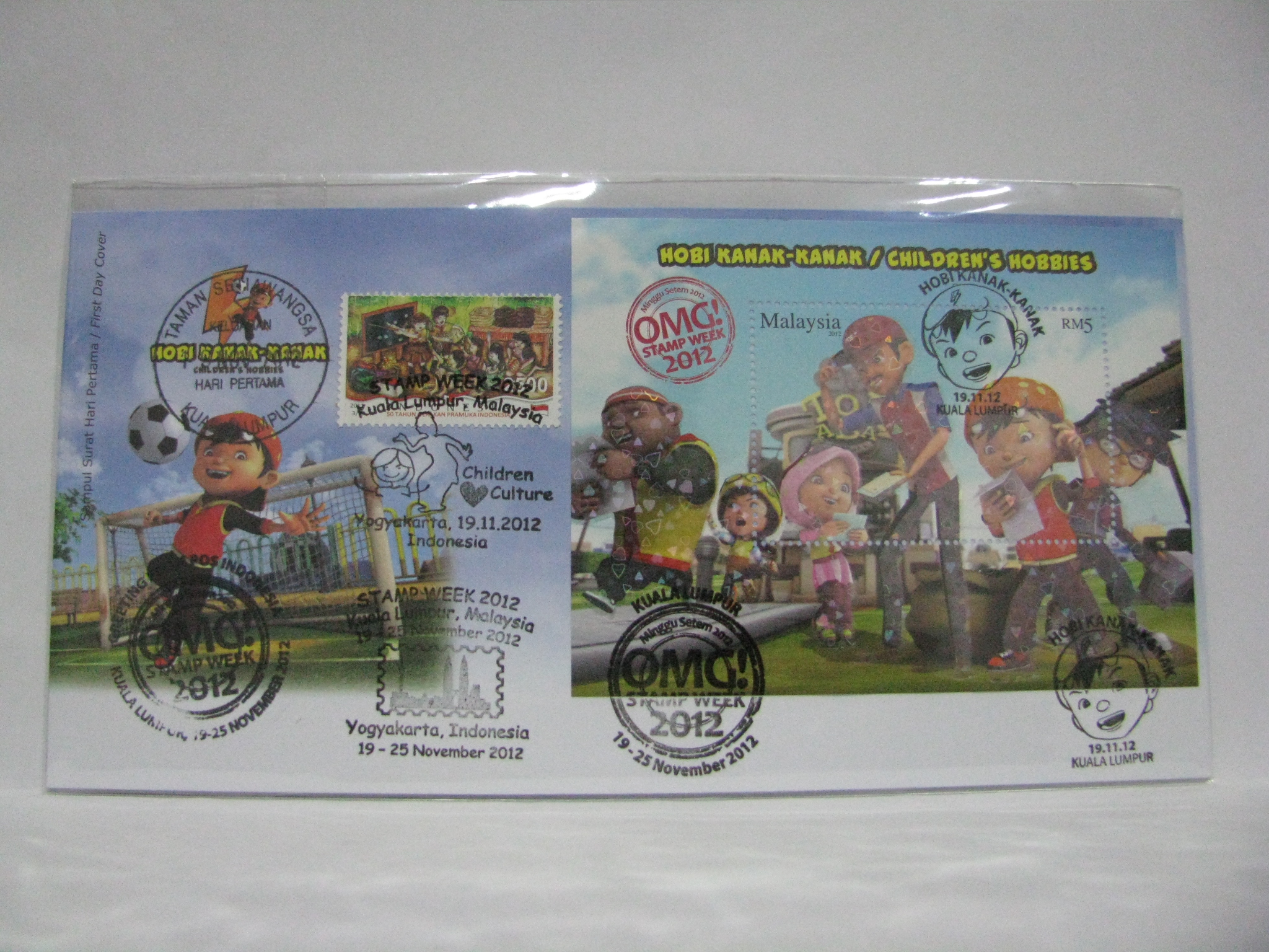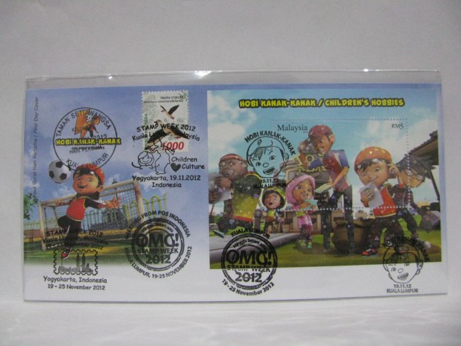 The FDCs were cancelled in Kuala Lumpur and Taman Setiawangsa along with the Stamp Week ’12 cache. An Indonesia stamp is affixed and cancelled with Pos Indonesia Children Culture Yogyakarta cancellation as well as Yogyakarta, Indonesia and Greeting from Pos Indonesia caches.