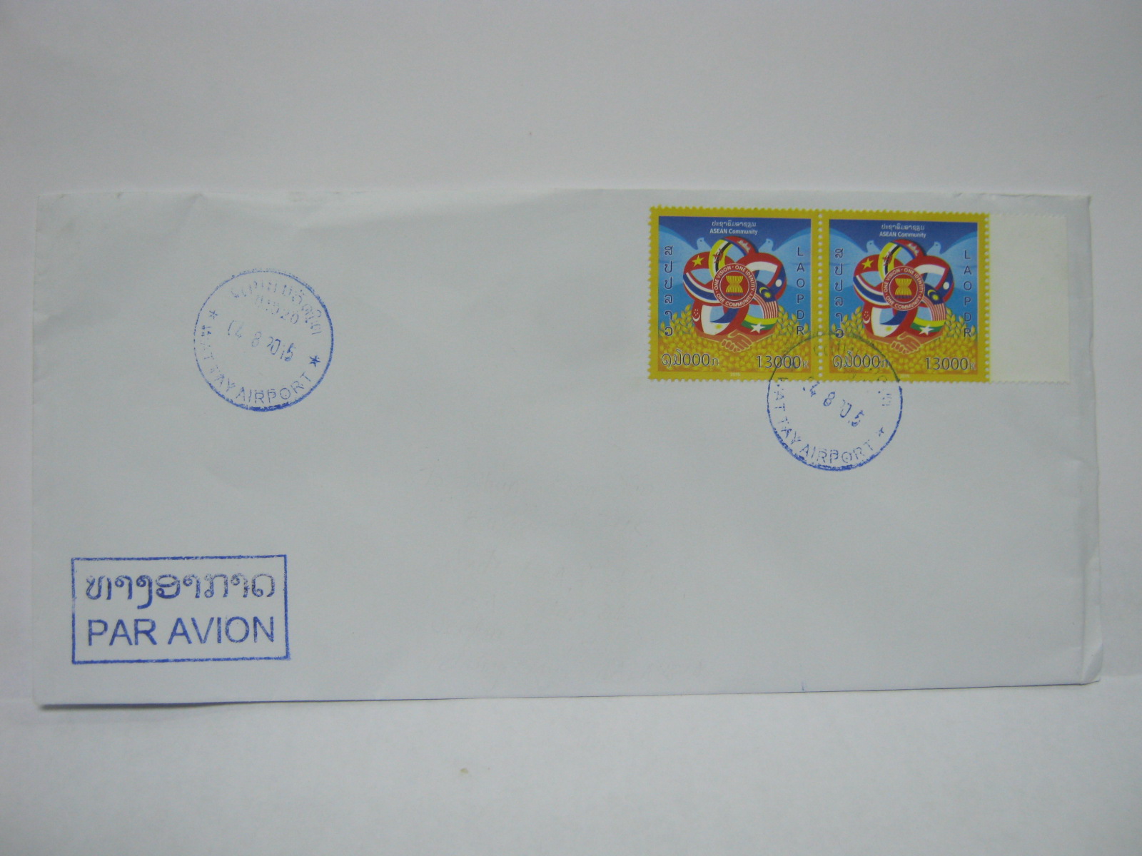 Though this is not an official FDC, it is an item of interest. This cover is cancelled on 04 August 2015 in Wattay Airport, Vientiane, Laos. Laos sold the stamps much earlier (as early as before 03 August 2015) than the official date (08 August 2015). I am unable to trace the first day of release.