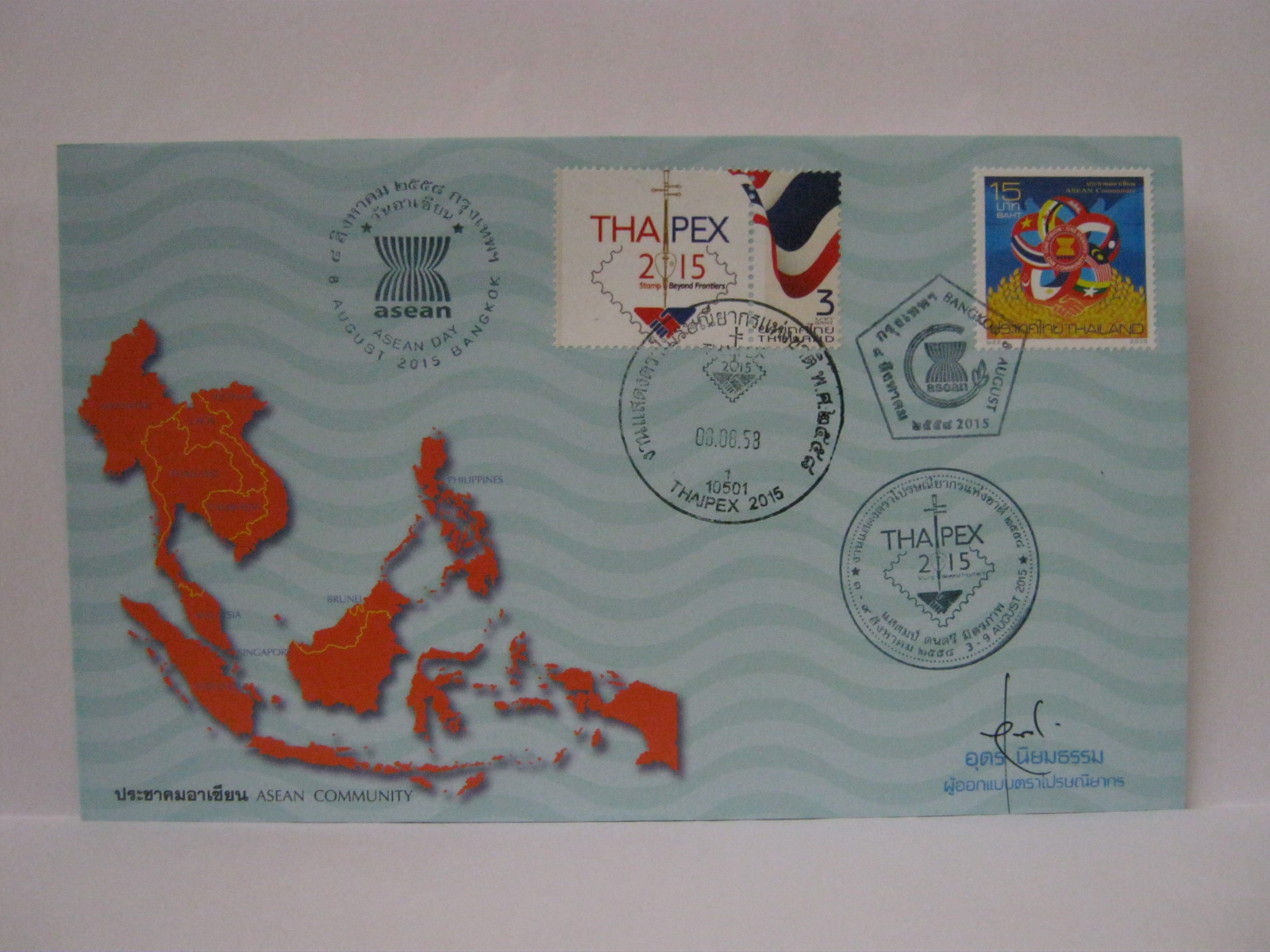 These FDCs were issued by Thailand and cancelled in Thaipex 2015 with the Thaipex 2015 cachet, Thaipex metal circular postmark, ASEAN Day cancellation and the Bangkok cancellation. The FDCs were signed by the Thailand Post designer, Mr. Udorn Niyomthum.