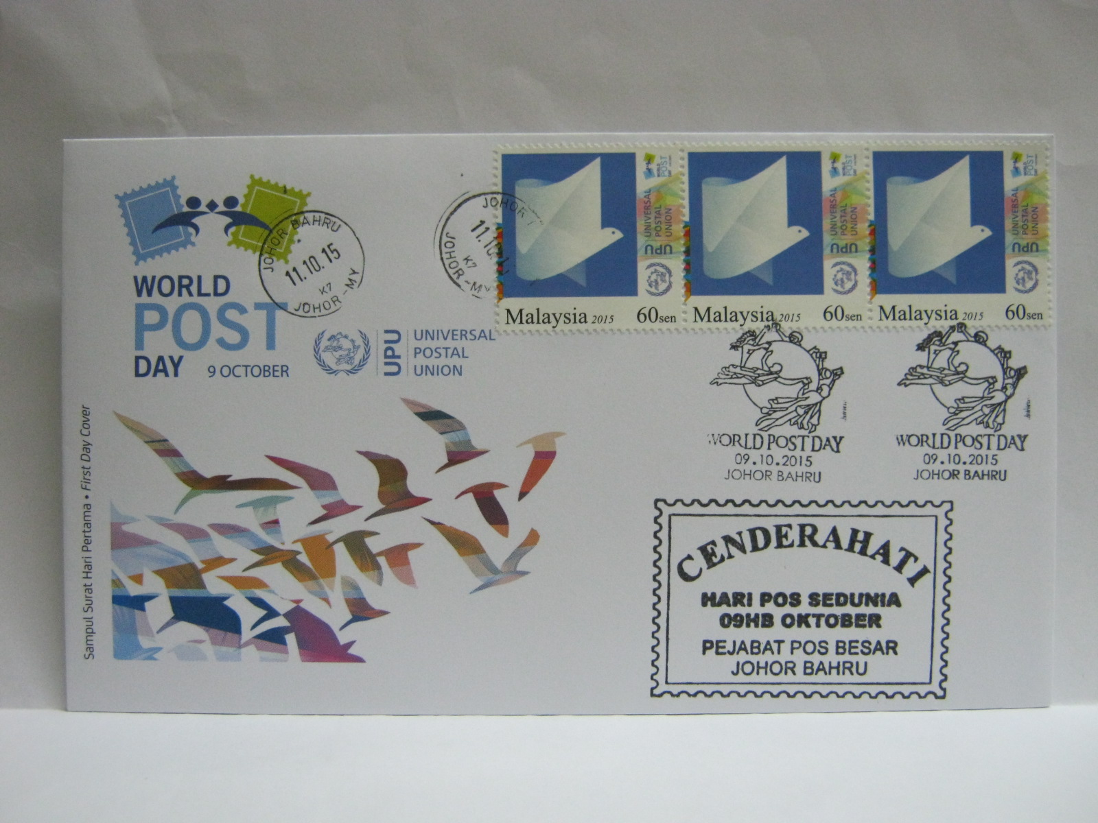 This FDC was cancelled in Johor Bahru along with the World Post Day Souvenir cachet from the Johor Bahru General Post Office. There are additional circular cancellations dated 11 October 2015 which is the date of release in Johor as 09 October 2015 is a weekend holiday in the state.