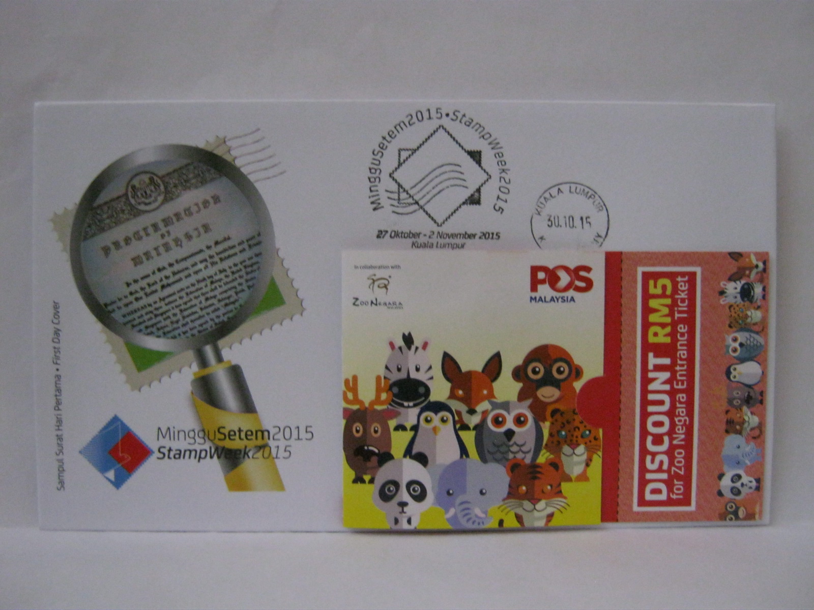 This FDC was cancelled with the Kuala Lumpur cancellation as well as the daily Stamp Week cancellation on 30 October 2015 along with the cachet.