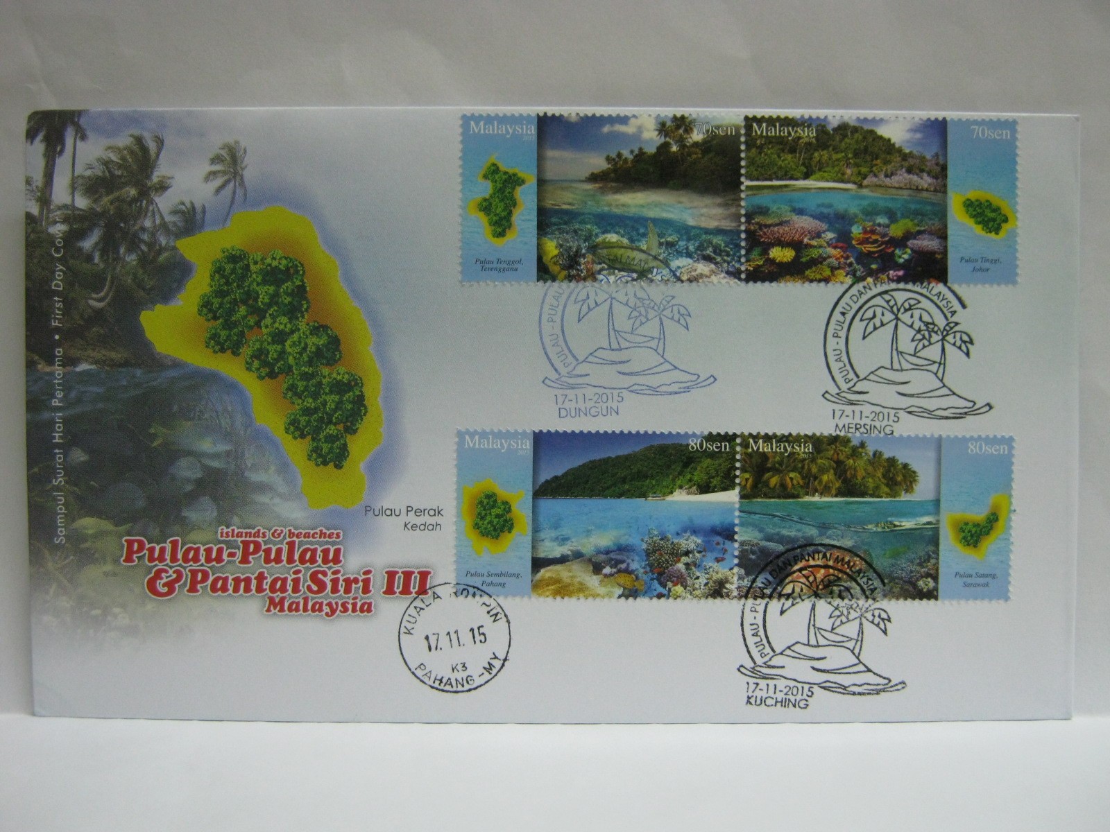 This FDC was cancelled in Dungun, Mersing, Kuala Rompin and Kuching corresponding to the nearest jetty to the islands.