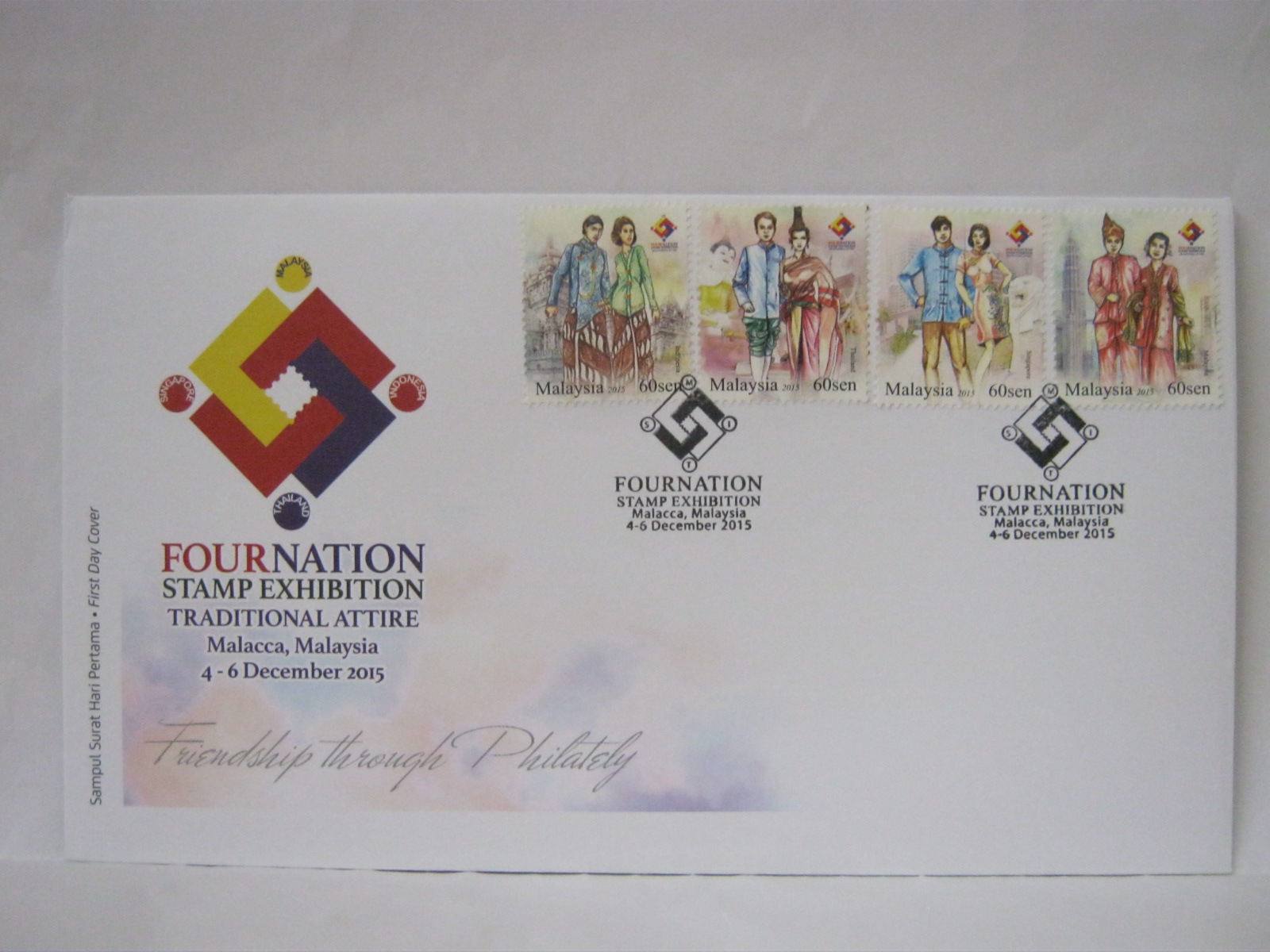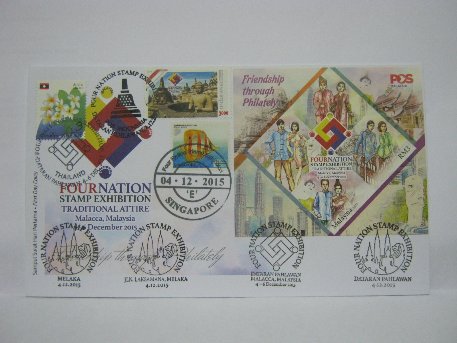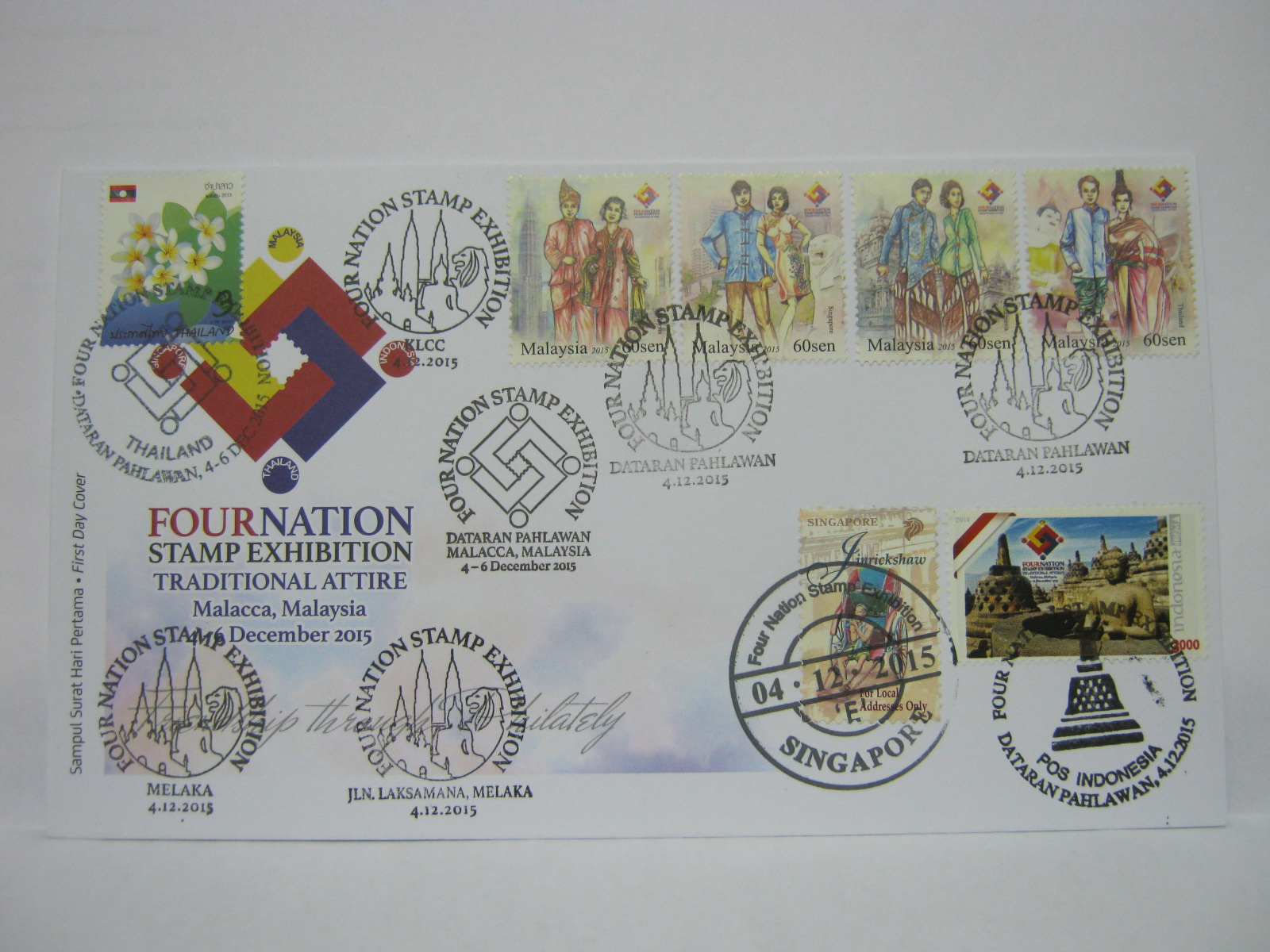 These FDCs were cancelled with the KLCC, Melaka, Jalan Laksamana and Dataran Pahlawan cancellations. There are also Singapore and Indonesia first day of issue cancellations and the Malaysia and Thailand exhibition cachets.