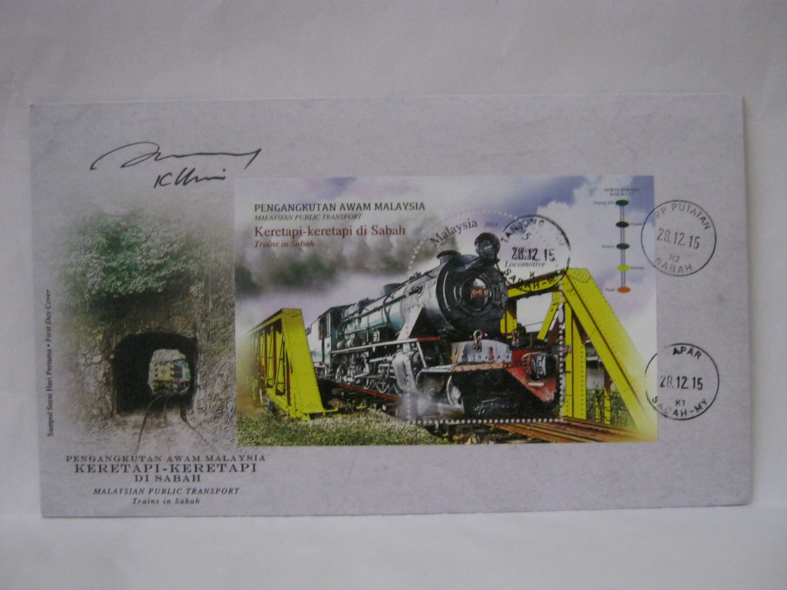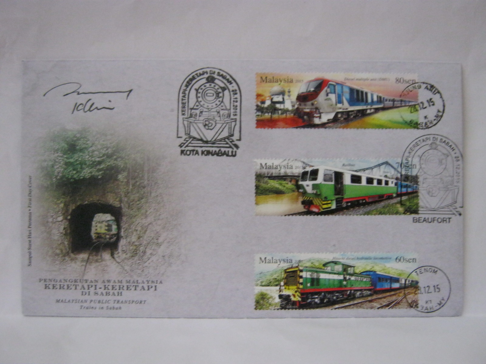 This FDC was cancelled in Kota Kinabalu, Tanjung Aru, Beaufort and Tenom. The FDC was signed by the designer, Mr. KY Lim.