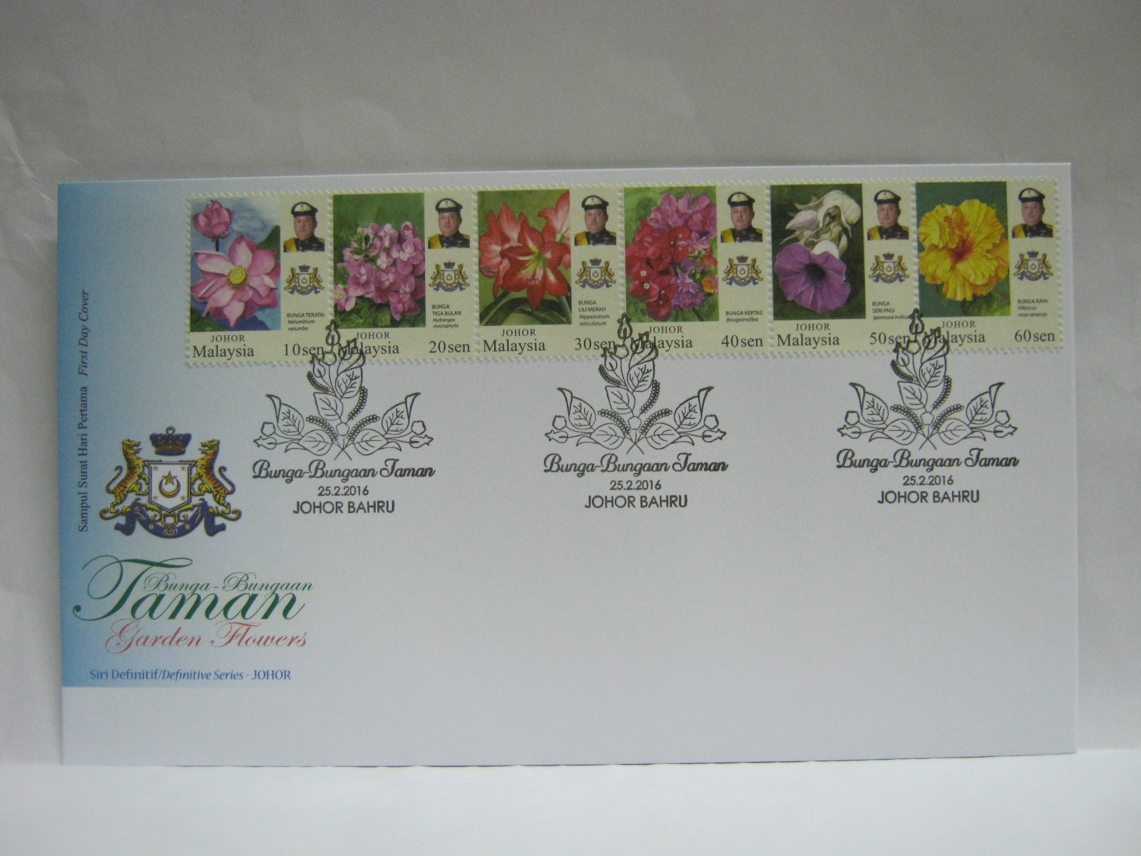 These FDCs were cancelled in Johor Bahru and autographed by the designer, Prof Dato Raja Zahabuddin Raja Yaacob.
