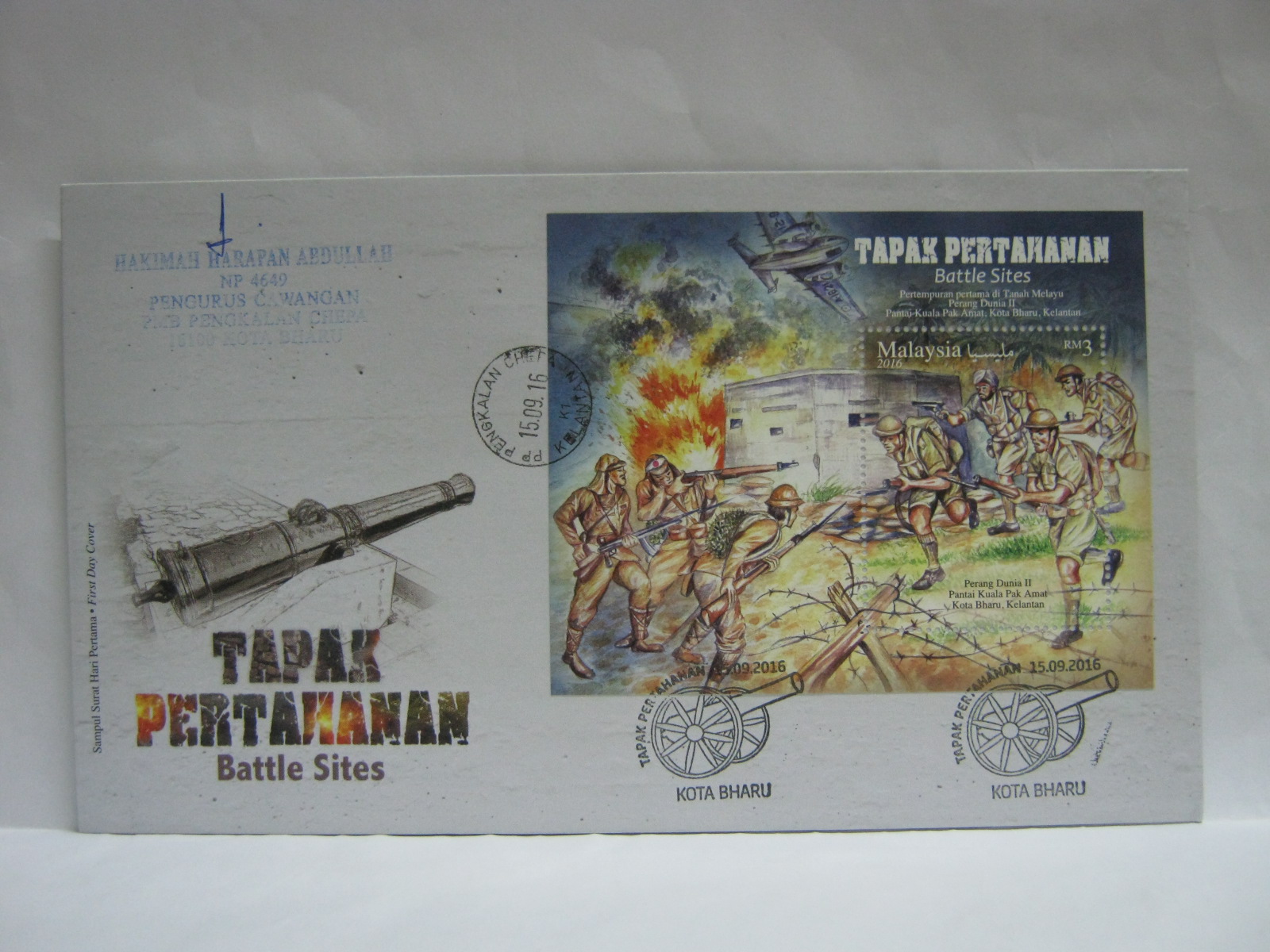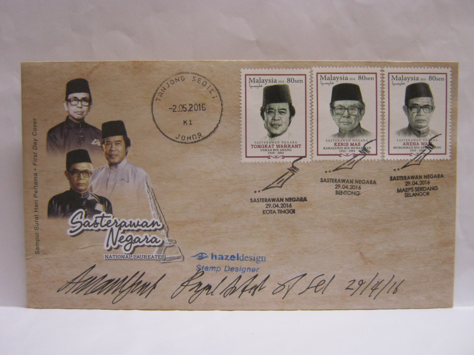 This FDC was cancelled in MAEPS (Malaysia Agro Exposition Park Serdang) where the stamps were launched, Bentong – home town of Kamaludin bin Muhammad and Kota Tinggi – home district of Usman bin Awang. The MAEPS cancellation was applied on Muhammad bin Abdul Baing as he was born in Jeneponto, Makassar, Indonesia. There is also a cancellation from Tanjong Sedili where Usman bin Awang was born. The date is 02 May 2016 as the Mini Post Office was only open on that day. 29 April to 01 May were weekend and holidays in Johor. The FDC was autographed by the designer, Dato’ Azman Yusof.