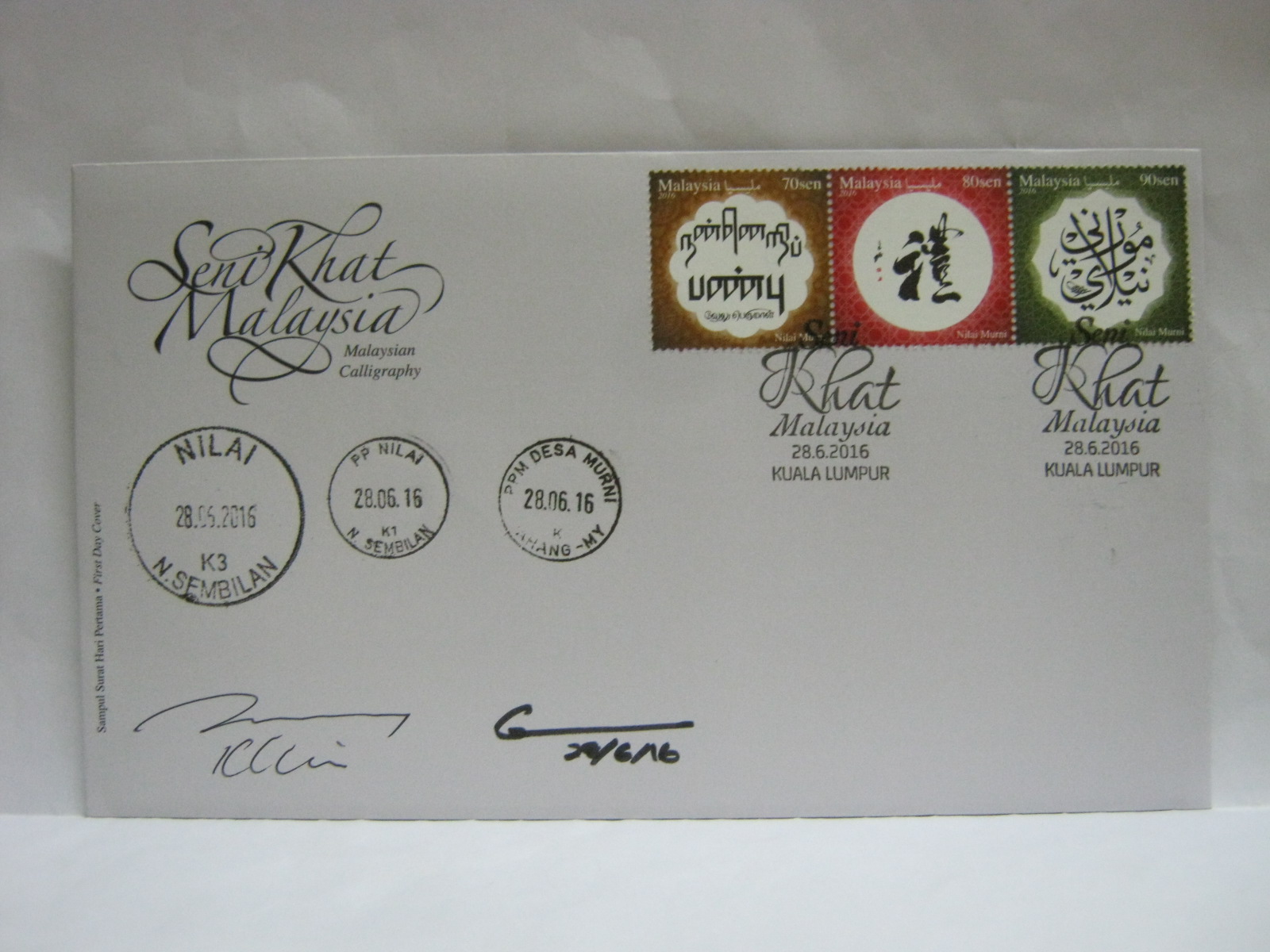 These FDCs were cancelled in Nilai and Desa Murni and autographed by the designer, Mr KY Lim and the calligrapher, Mr Velu Perumal.