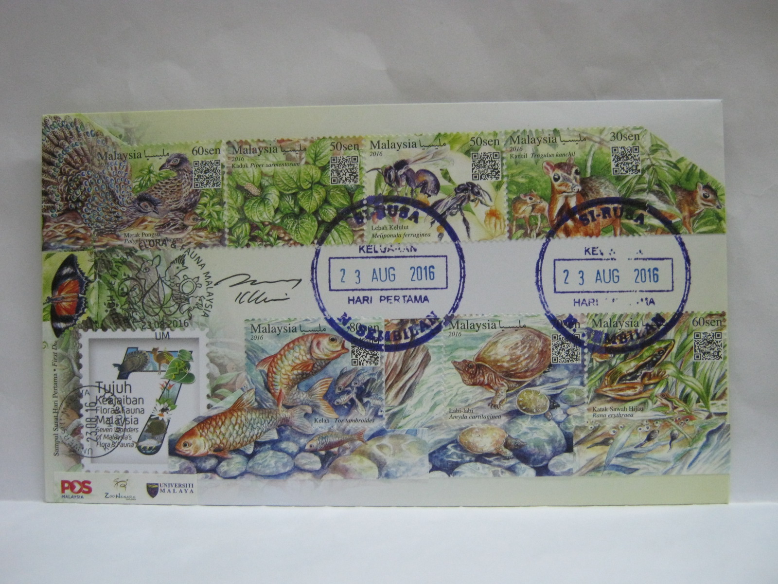 This FDC was cancelled in Si Rusa and Universiti Malaya and autographed by the designer, Mr KY Lim.