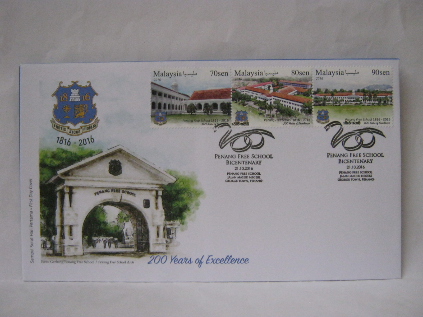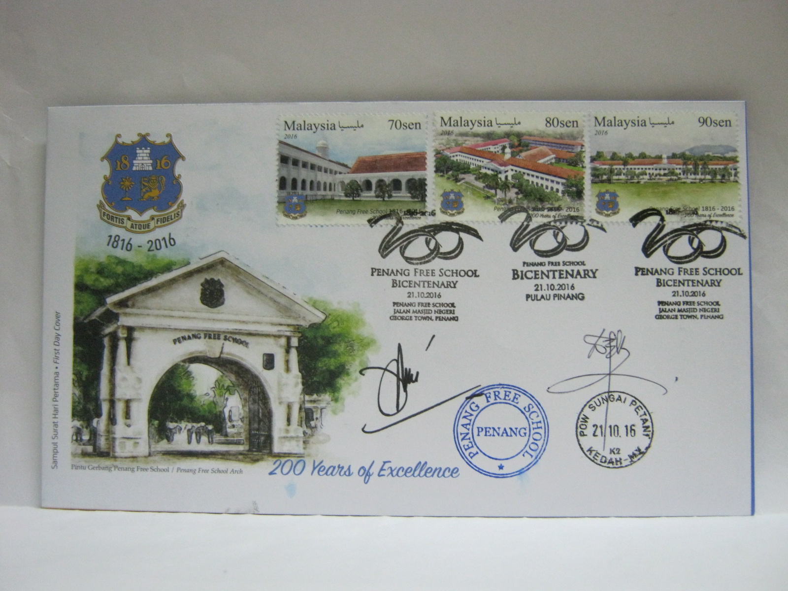 This FDC was cancelled with the Pulau Pinang, Penang Free School Jalan Masjid Negeri, POW Sungai Petani and Penang Free School official cancellations. This FDC was autographed by the School Headmaster, Mr Omar bin Abd Rashid and the 80 sen and 90 sen stamps photographer, an Old Free, Mr David Wong Eng Boo. This envelope is the official Penang Free School Bicentenary Committee official envelope version 1.