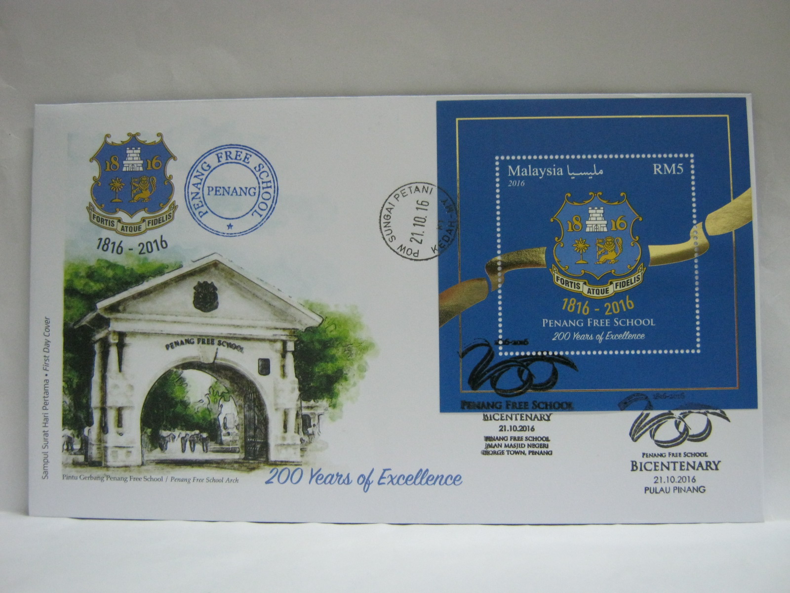 This MS FDC was cancelled in Pulau Pinang and Penang Free School Jalan Masjid Negeri, POW Sungai Petani and Penang Free School official cancellations.
