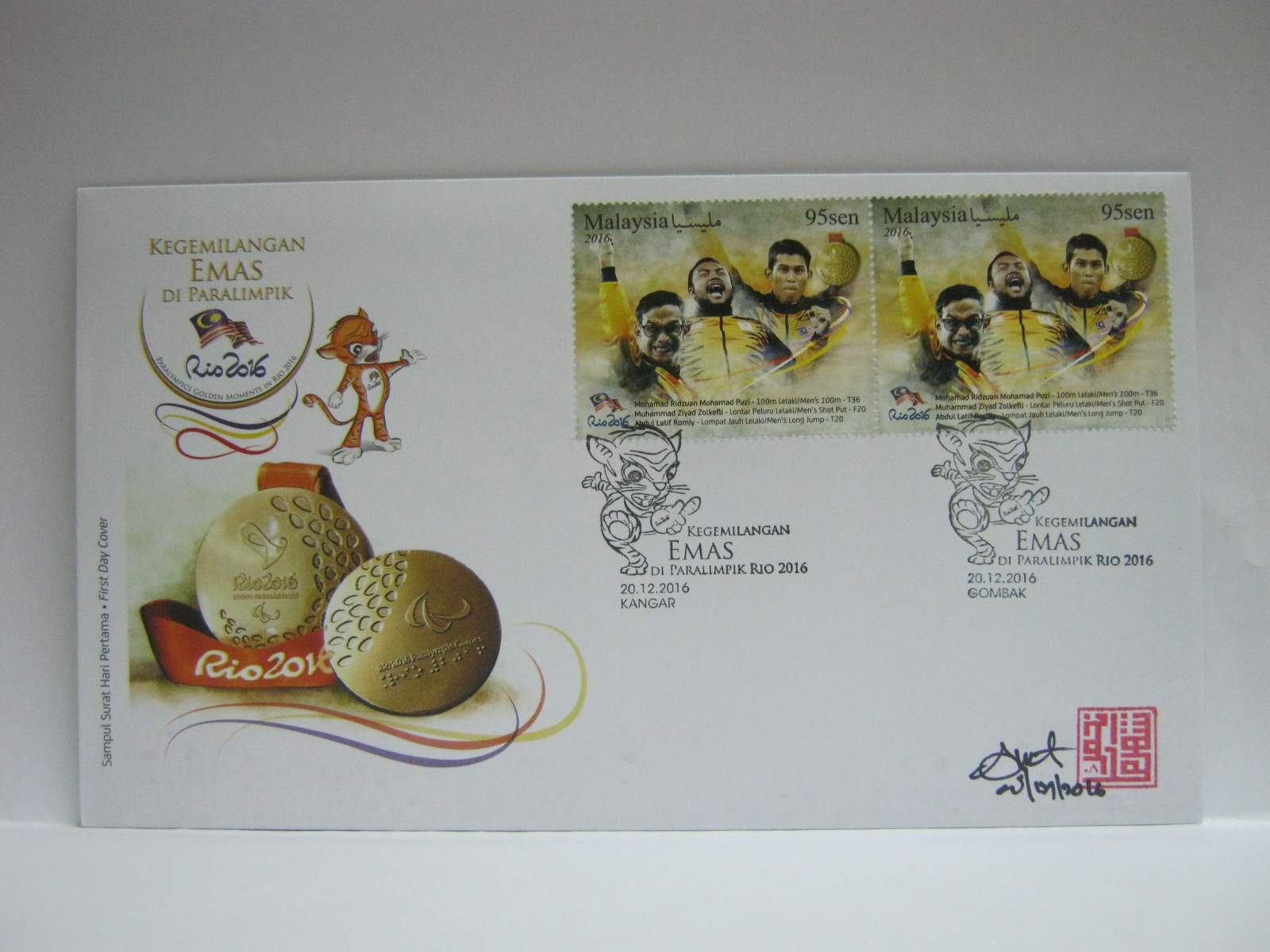 This FDC was cancelled in Kuala Lumpur (location of the launch of the stamp) and Gombak. The covers was autographed by the 3 gold medalist (Mohamad Ridzuan Mohamad Puzi from Padang Besar, Abdul Latif Romly from Arau and Muhamad Ziyad Zolkefli from Gombak) and the designer, Mr Shahrul Izhar.