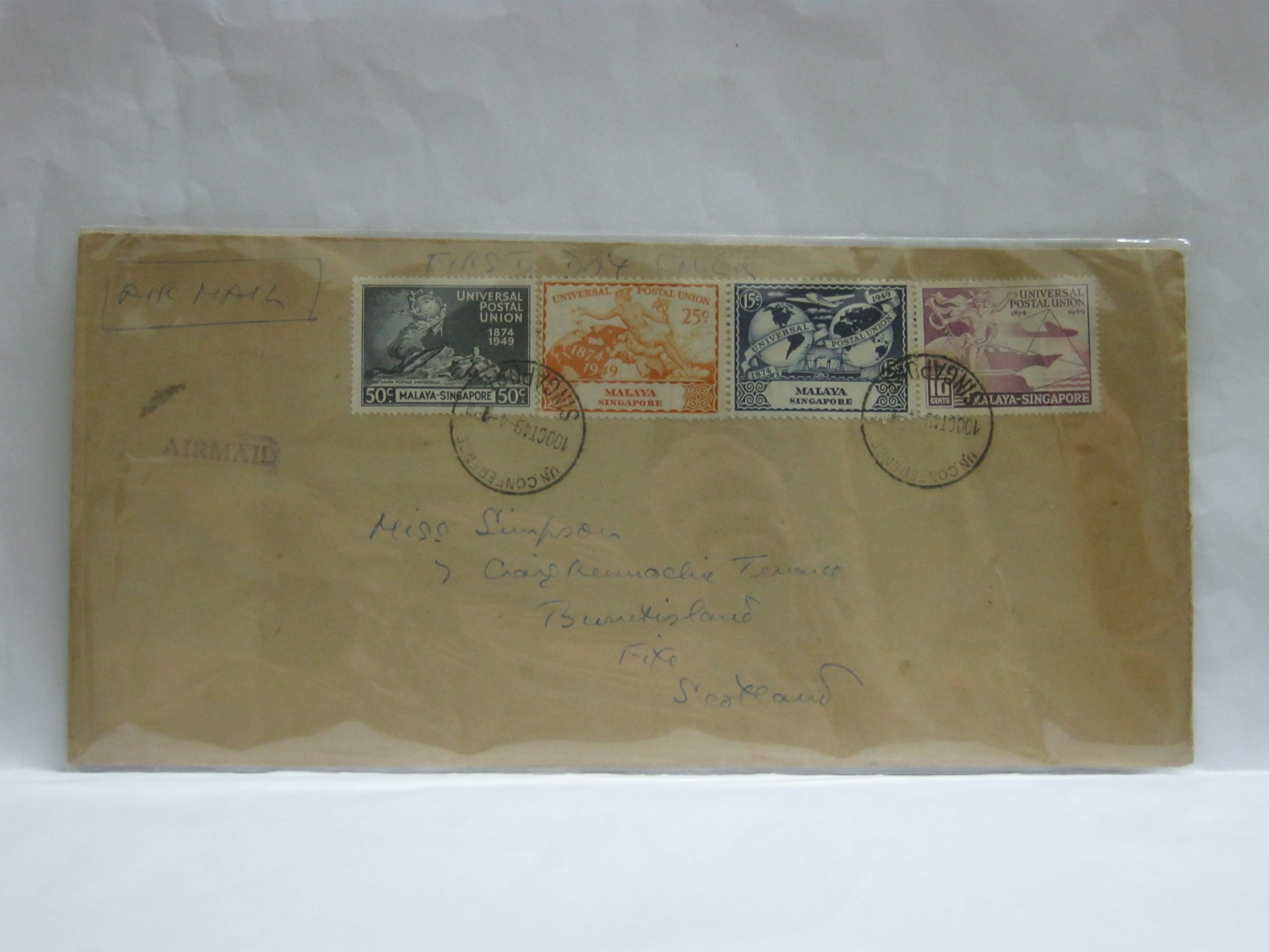 This FDC was cancelled with the U.N. Conference Singapore 29 mm diameter cancellation. There is a similar cancel with a 26 mm diameter.  A post office was set up inside the Victoria Theatre and Memorial Hall where the UN Conferences were held from September to end of October 1949. The conferences were ILO Regional Conference (12 – 23 September 1949), FAO Pre-Conference Regional Meeting (26 September – 01 October 1949) and the 5th Session of ECAFE (20 – 29 October 1949). The back is cancelled with the United Nations Conferences Singapore September – October 1949 cachet. The cachet is used on the mails during the conference. The 10 October 1949 date is hard to obtain as it coincides with the first day of issue of the UPU series.