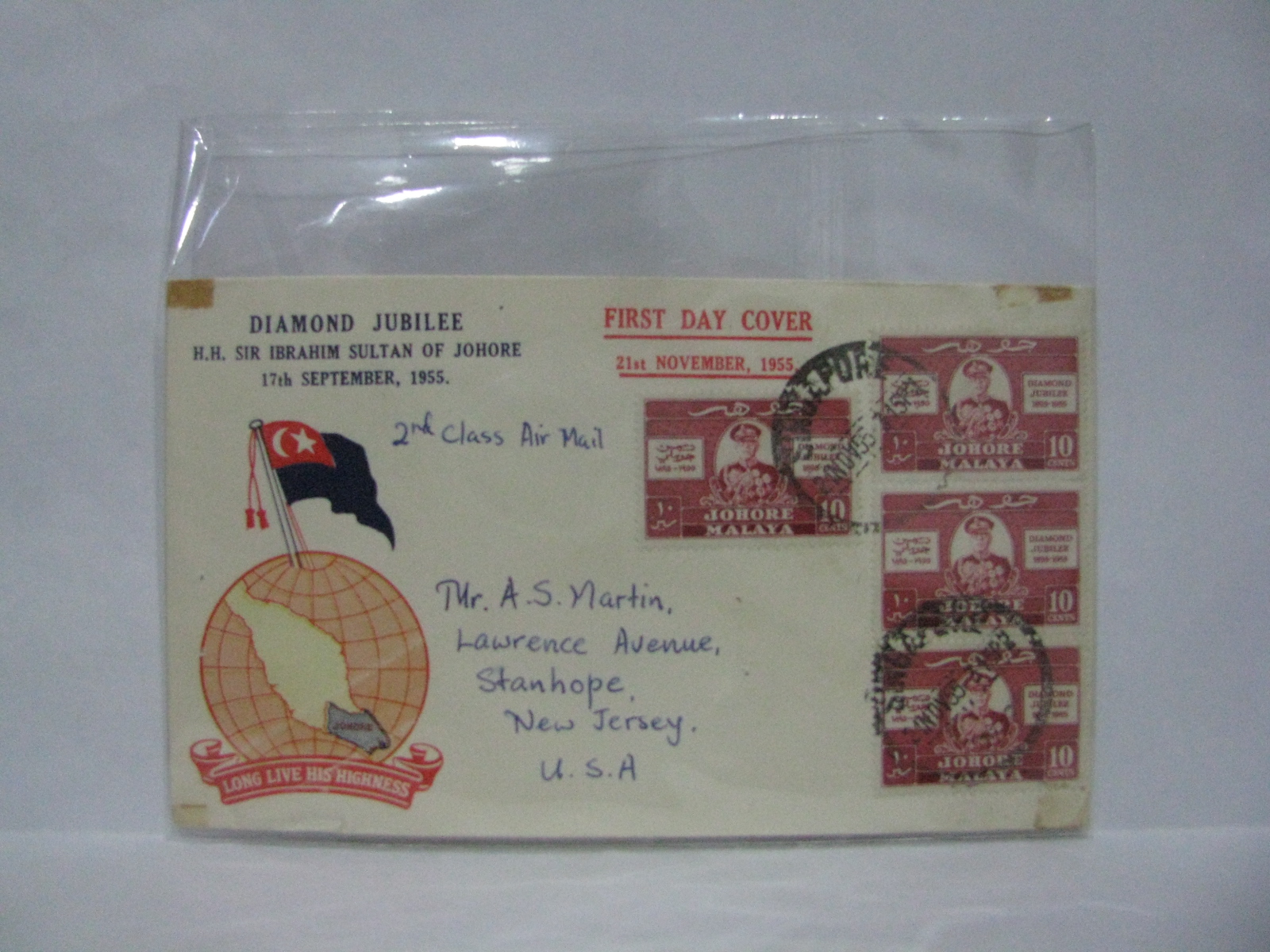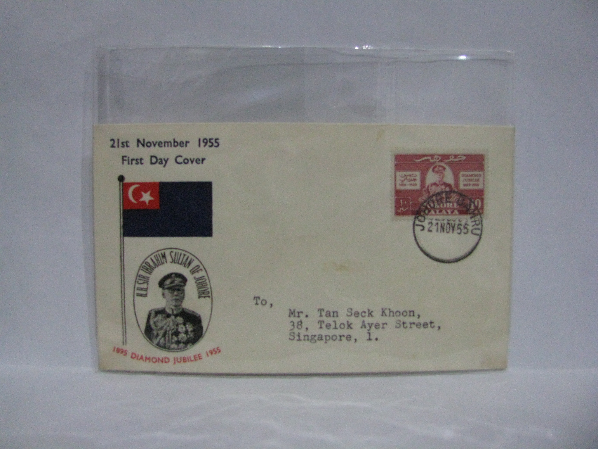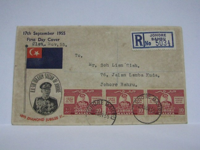 This FDC was cancelled in Johore Bahru and was sent via registered mail. The date of issue was moved to 21 November 1955.