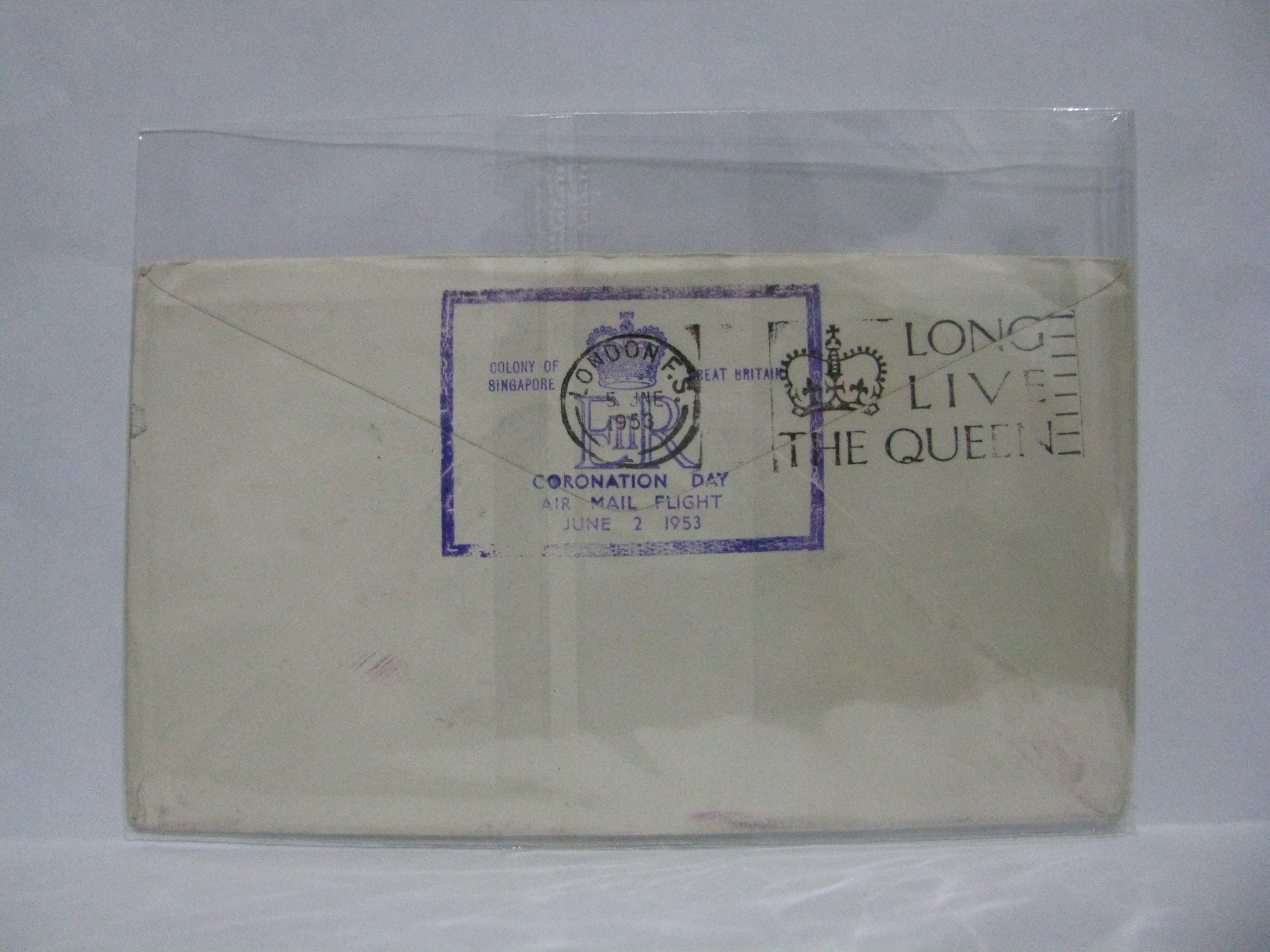 This is the return cover from UK back to the territory. Here is the cover from UK to Cocos Island with back cancellations from Singapore and Cocos Island. It is cancelled on the first day of issue on 03 June 1953.