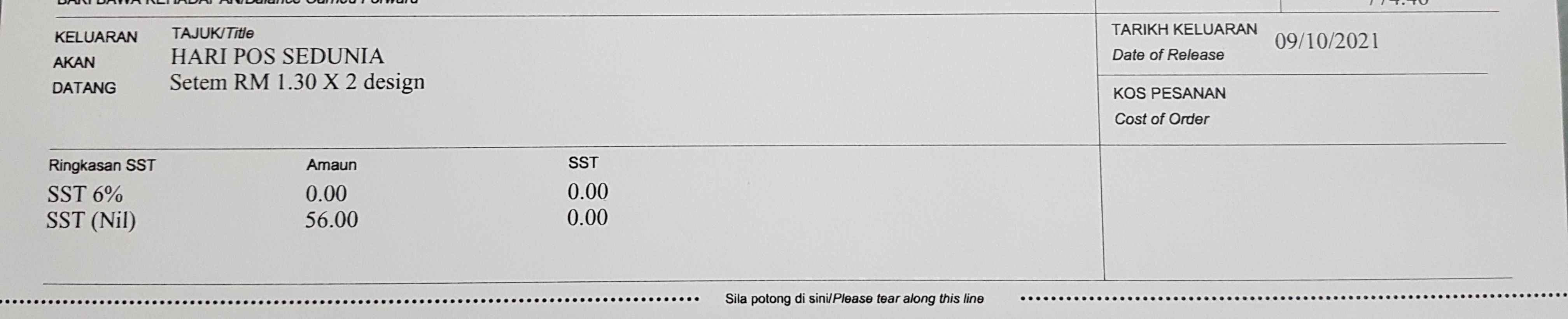 It further hints that the issue will be on 09 October 2021….. World Post Day? 2 stamps of RM 1.30 each.