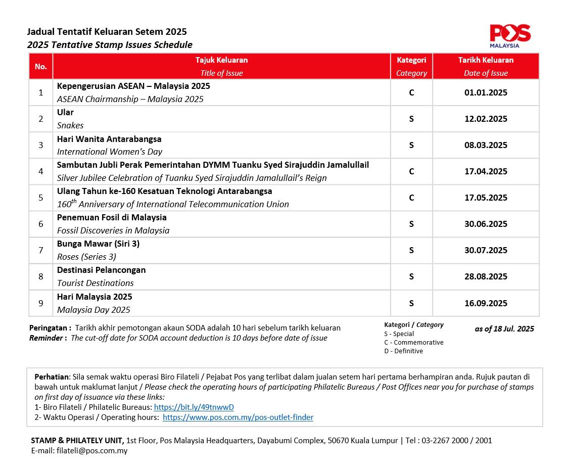 18 July 2025: Latest Tentative Malaysia Stamp Issue Programme Schedule