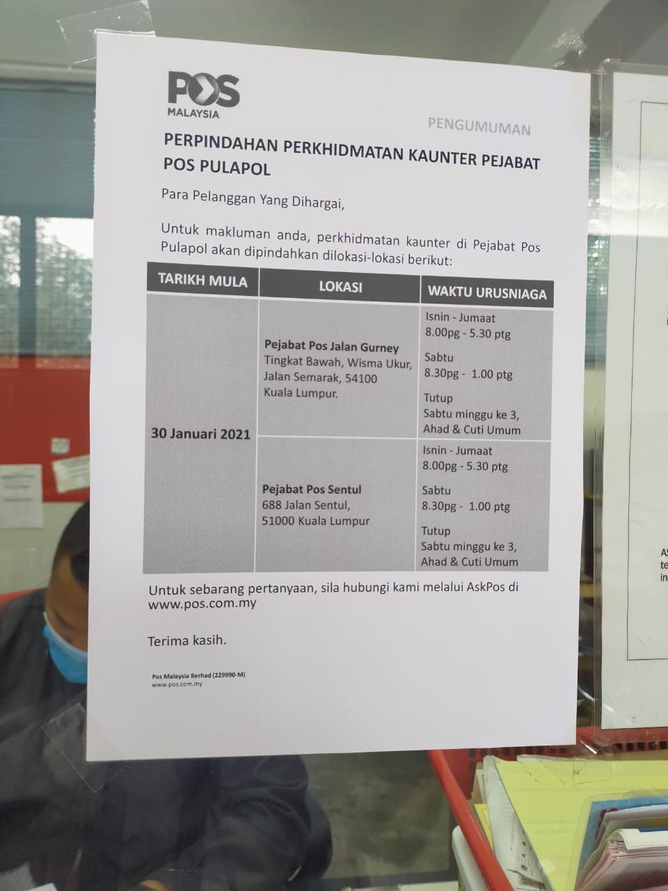 A kind reader, En. Chucky Ray, kindly shared the photo of the memo announcing the relocation of the Pusat Latihan Polis (PULAPOL) Post Office service from 30 January 2021 to Jalan Gurney Post Office and Sentul Post Office.