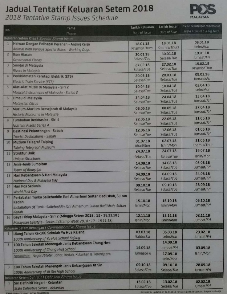 Here is the updated Malaysia Stamp Issue Schedule. As usual, take note of the next issue which is Musical Instruments of Malaysia – Series 2.
