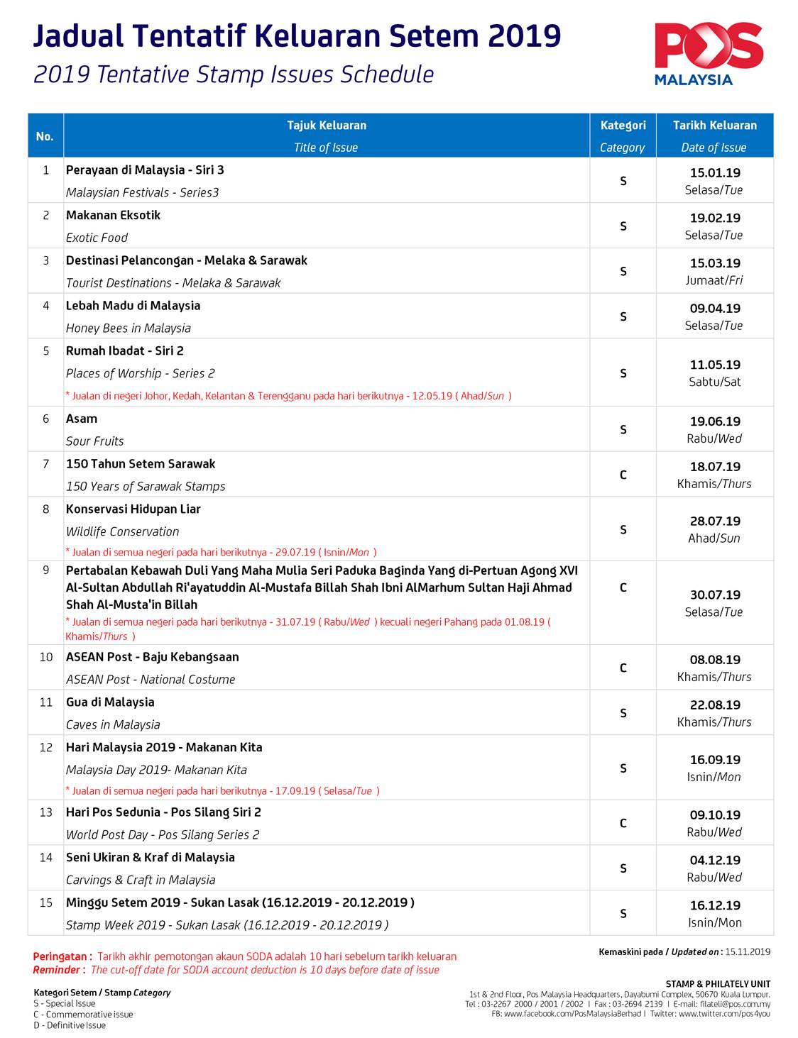 It seems like there are 2 more issues in December 2019 to close the philatelic year. Apparently the Carvings and Craft in Malaysia stamp issue has been move to 04 December 2019.