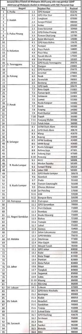 I would like to thank KH Chung for sharing this updated list from the Philatelic Bureau. Here are the latest 95 locations of the Philatelic Bureau branches with special pictorial cancellation (chop):