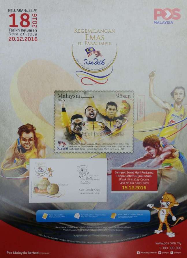 This issue will be a single stamp of 95 sen issued in a sheetlet of 15 stamps. There will be a folder. The designer is again, Mr Shahrul Izhar from World Comm.