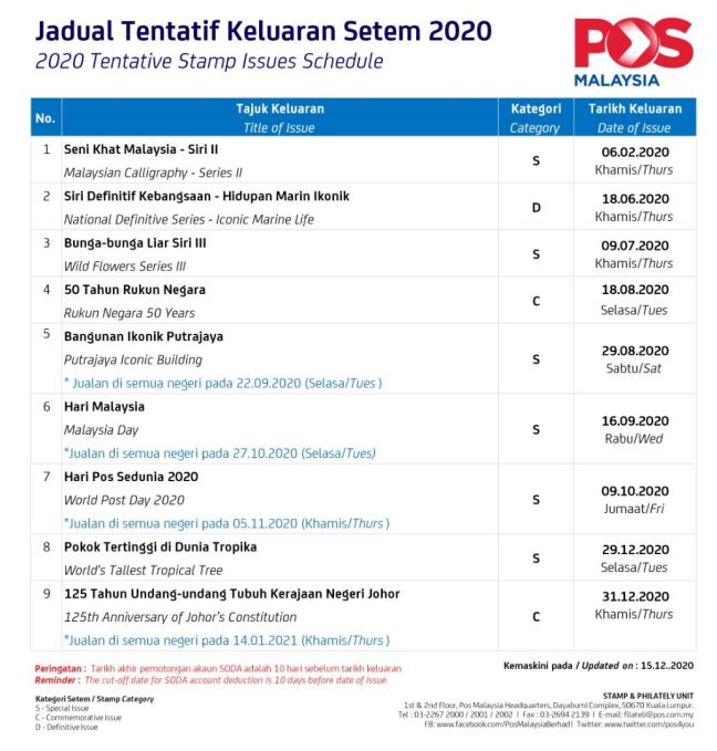15 December 2020: Latest Updated 2020 Malaysia Stamp Issue Programme