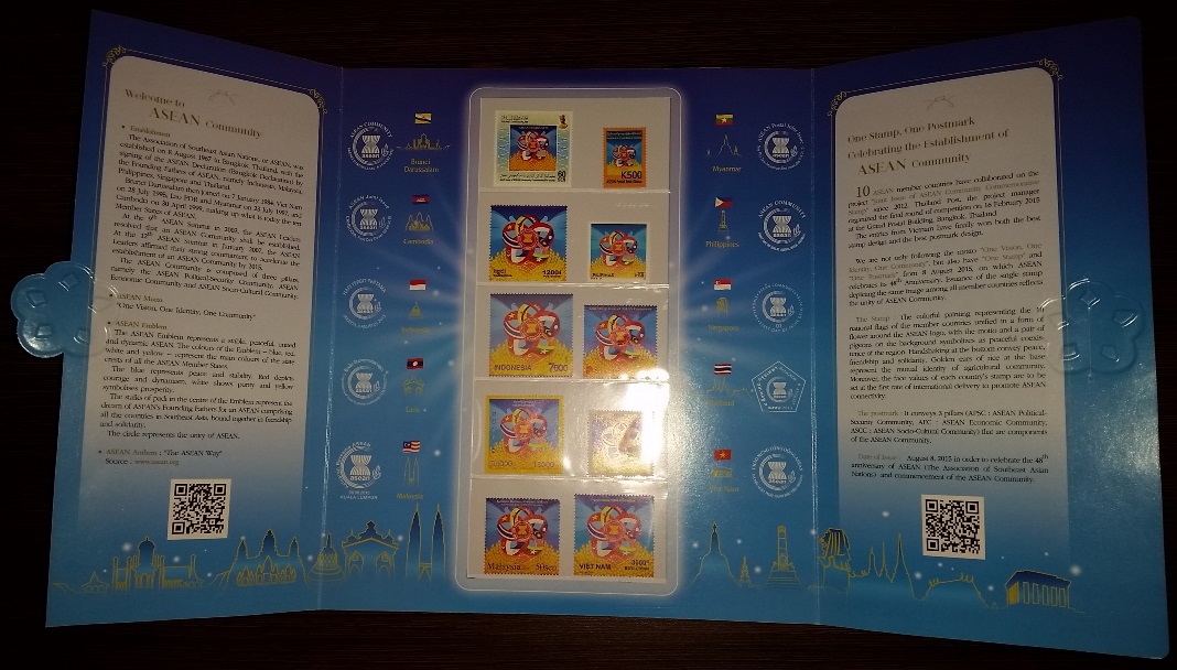 Turned out, I was the first at the counter in Thaipex 2015! Yes, ASEAN Community Joint Issue day is finally here. Thailand Post only released the ASEAN Community Joint Issue in Thaipex 2015. It was not even on sale in the General Post Office attached next door. Neither was this available elsewhere (I asked a few bureau branches). So today’s sale is limited release.
